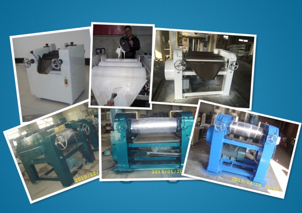 該設(shè)備由三個輥筒組成,裝在一個機架上,由電機直接帶動。一般輥筒間的轉(zhuǎn)動方向不同,前輥向前轉(zhuǎn)動,中輥向后轉(zhuǎn)動。輥子轉(zhuǎn)速前輥快、后輥慢。中間輥固定,前后兩輥裝在滑道上,有彈簧裝置,用手輪調(diào)節(jié)前后輥與中輥的距離。物料由后輥與中輥之間進(jìn)入,受到輥筒的擠壓,產(chǎn)品顆粒變細(xì),然后由快輥帶出,快輥末端裝有刮刀,使物料與輥筒分離,落入收集桶內(nèi)。由于研磨過程產(chǎn)生大量熱量,各輥筒的中心是設(shè)計為空心結(jié)構(gòu),通水冷卻,保證產(chǎn)品質(zhì)量。